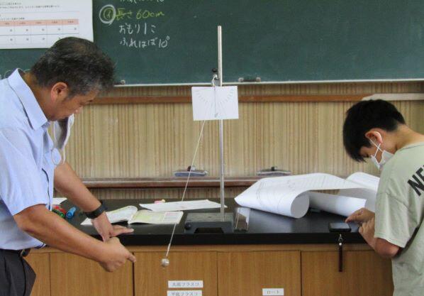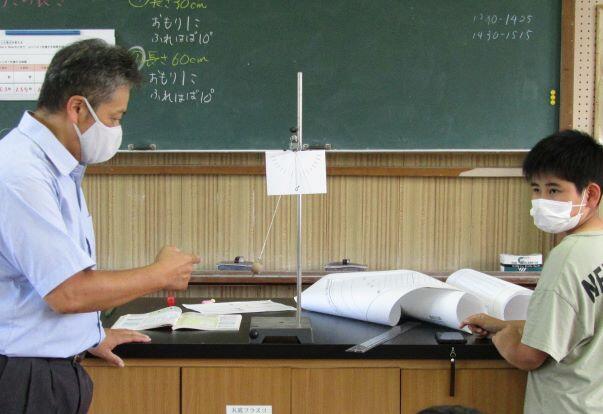 5・6年生は理科の授業でした。振り子のについての実験でした。振り子の長さを変えています。10回振れる時間を計って、