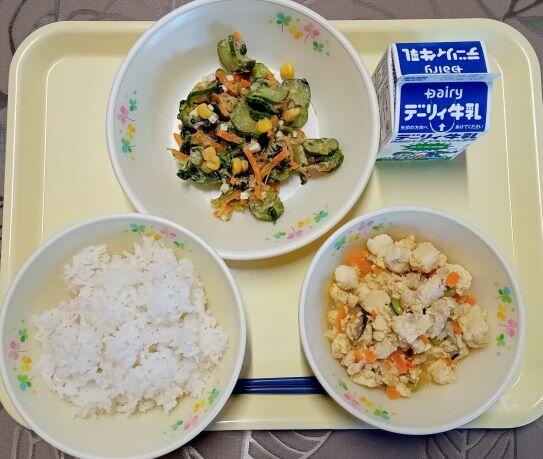 最後はこの日の給食です。1学期最後となりました。この日のメニューは 麦ご飯、いりどうふ、ビタミンAサラダ でした。