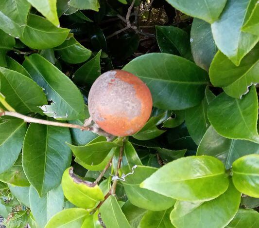 垣根に再び大量発生しています!(>_<) 下の右側の写真です。分かりにくいですが、頭とおしりがオレンジ色の幼虫です。