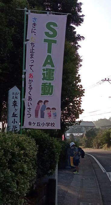 最後はのぼり旗です。校門前の道路にのぼり旗が立っています。小林市は「健幸都市(けんこうとし)」を目指しています。
