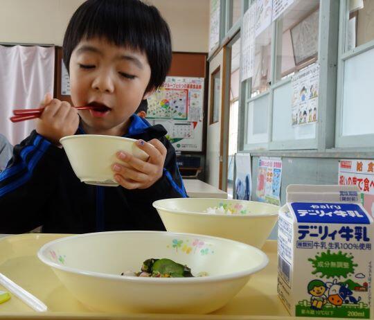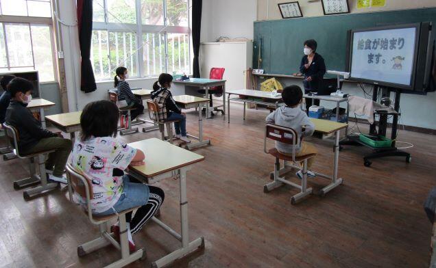 いました。次は給食です。1年生は当番はまだです。廊下で上級生が給食の準備をするのを見ていました。