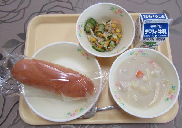 という流れで令和3年度の給食が始まりました。この日の給食のメニューは コッペパン、豆乳のクリーム煮、彩り和え