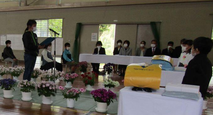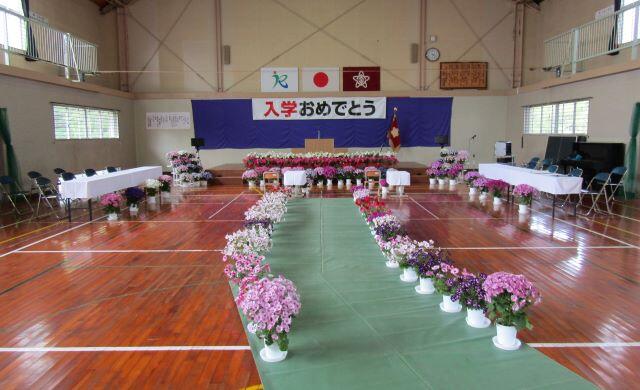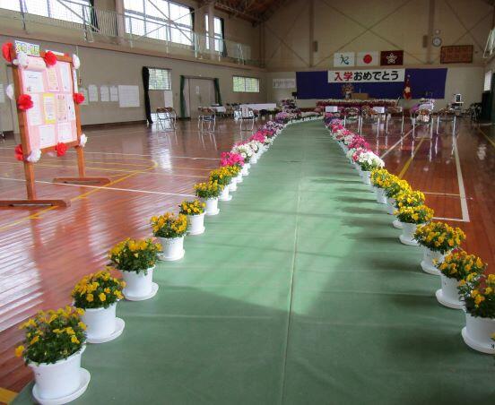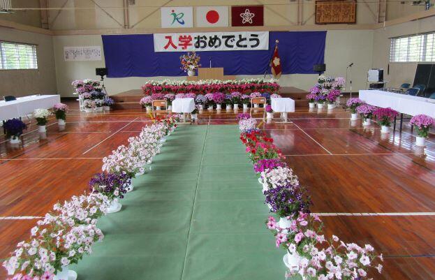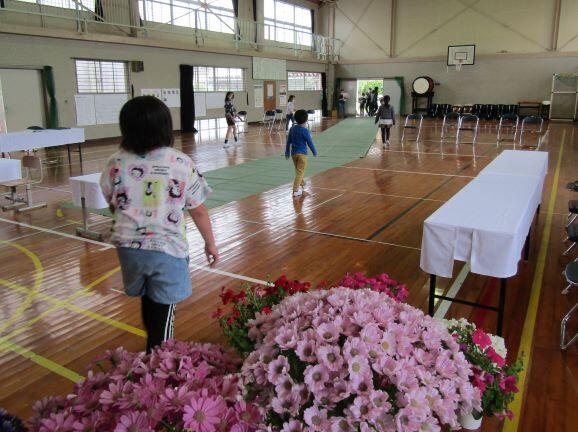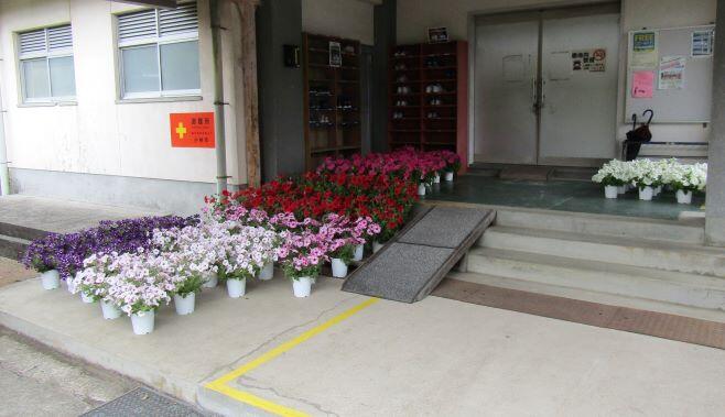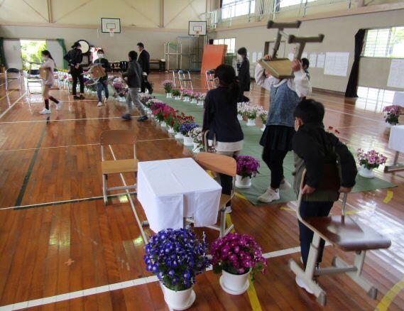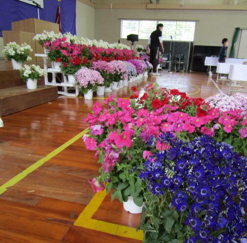 体育館入り口の前には、たくさんの花がありました。4校時の準備ではイスや机を並べて通路になるシート敷きまで