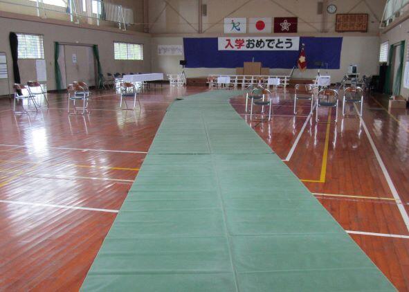 バッチリです!立て看板も入り口に設置しました。祝詞も体育館へ。式場は静かです。あとは子どもたちを待つばかりです。