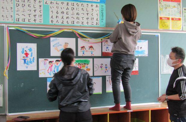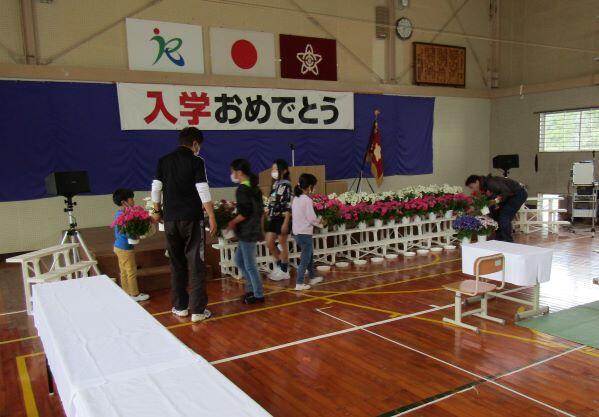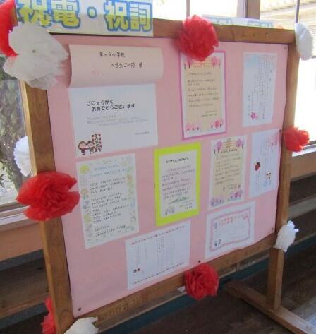 一方、1・2年生教室の飾り付けは・・・?1・2年の担任の先生がコツコツとやっていました。式場ができあがったので、