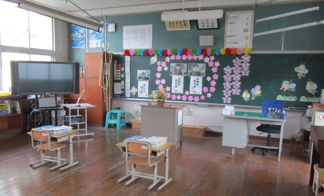 1・2年生の教室です。前の日は遅くまで担任の先生が最後の仕上げの飾り付けや整理をされていました。新入生の道具も