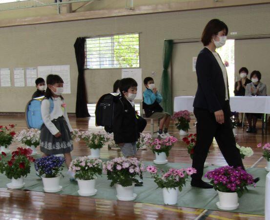 担任の先生を先頭に、新入生2名の入場です。(*^_^*) PTAから入学のお祝い品をいただきました!