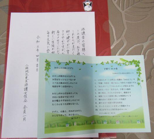 (上の写真、左から)小林地区更正保護女性会様から【手作りの手帳(メッセージカード)】、県交通安全協会様から