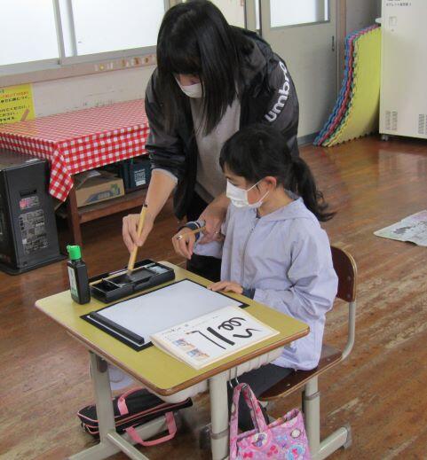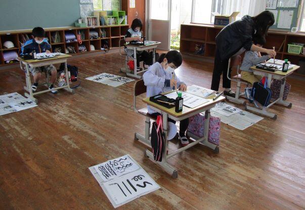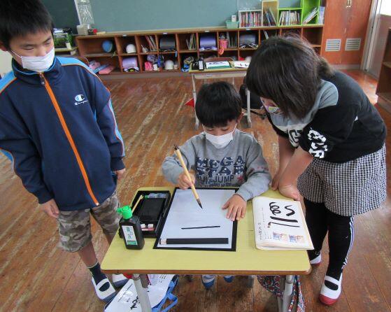 初めての習字(毛筆)です。真新しい習字道具を使いました。先生だけでなく、4年生も少し3年生に教えていました。(^_^)