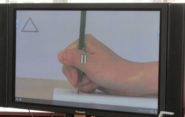 1年生の授業をのぞいてみました。えんぴつの持ち方、正しい姿勢等を学習していました。映像で分かりやすくなって