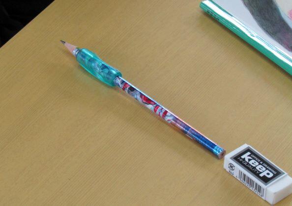 1年生は入学祝いにたくさんの品物、学用品をいただきました。えんぴつを正しく持つために、下のようなグリップが