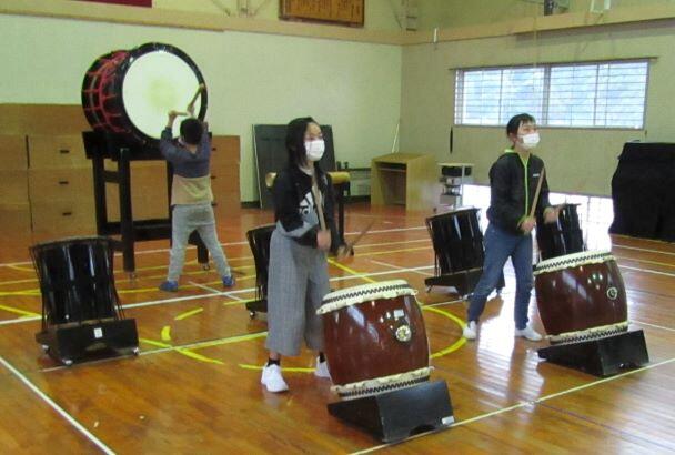 5・6年生は3人です。5・6年生だけのパートもあるので、太鼓を2つ並べて、人数の少なさを音量を上げることで