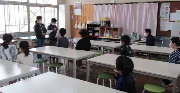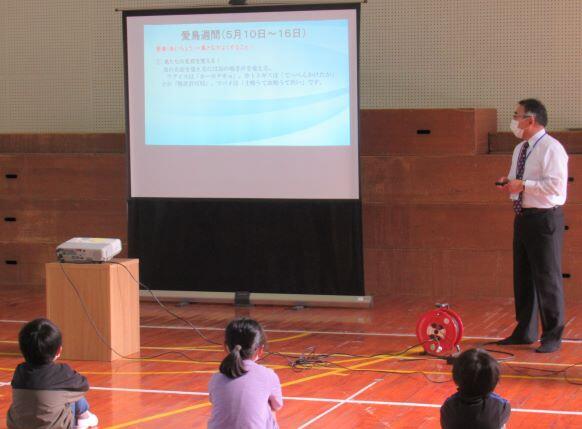 また、この日は全校朝会がありました。校長先生からはこの日から始まった「愛鳥週間~16日」に関して、身近な鳥を