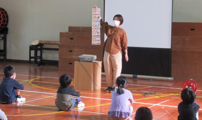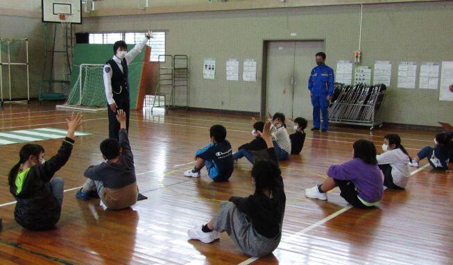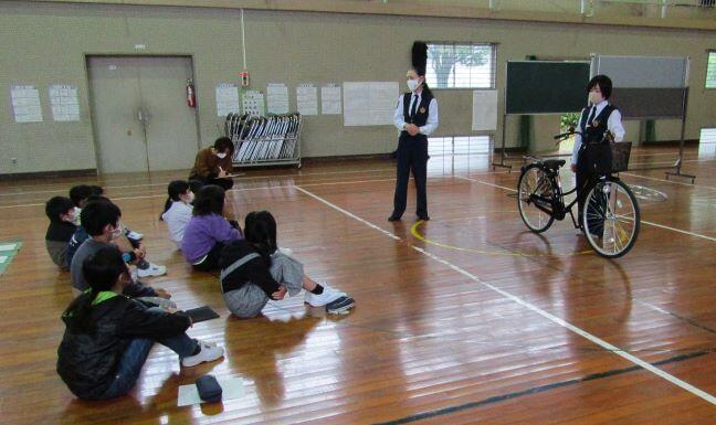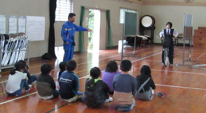 5月7日(金)に交通教室がありました。この日はあいにくの雨で、体育館で行いました。小林警察署と小林交通安全協会