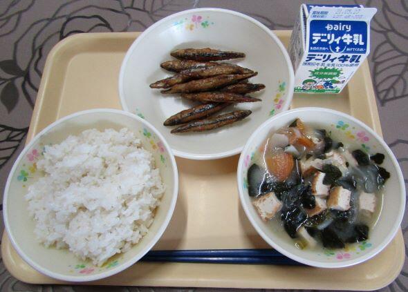 最後はこの日(11日)の給食です。メニューは 麦ご飯、きびなごの蒲焼き、ジャガイモの味噌汁 です。きびなごは