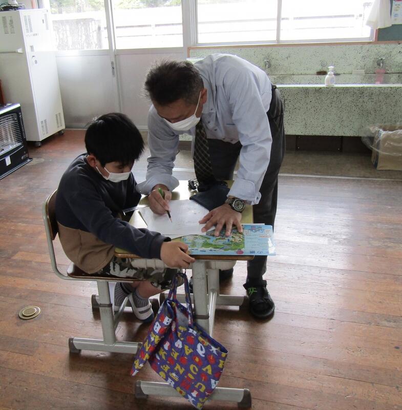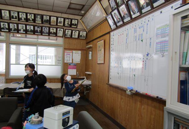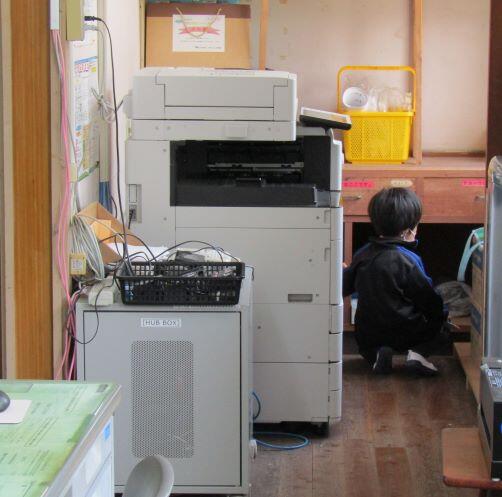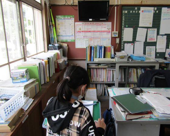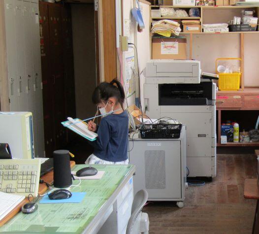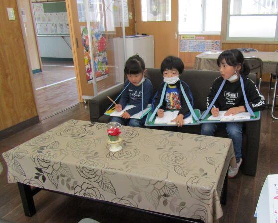 職員室の中にある、印刷室の奥が気になるようです。(^_^) 探検メモを書いています。2年生はテレビが気になった
