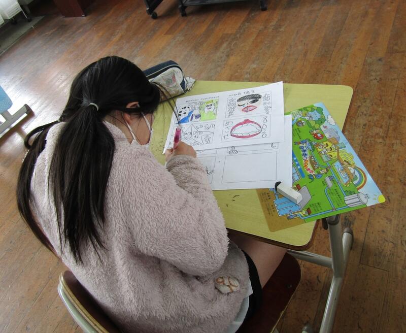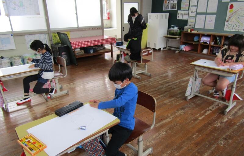 3・4年生は図工(上の左)で、ポスターを描いていました。ポスターは文字と絵のバランス、そして、絵の構図が