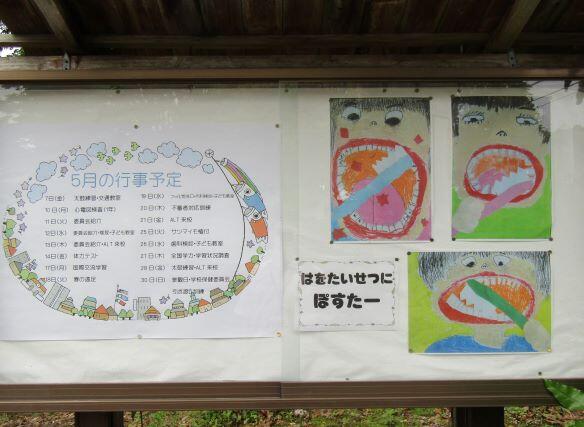 スタートとは・・・?まずは校門近くの掲示板です。5月仕様になりました。5月行事と1・2年生の作品が掲示されました。
