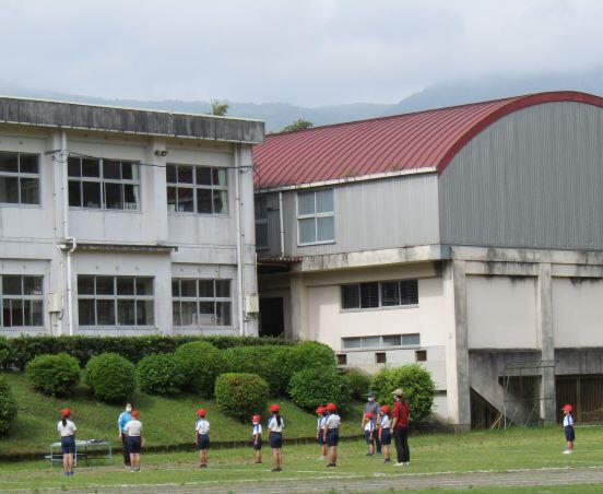 1・2年生です。上の左は音楽で、校歌の練習をしていました。真ん中の2年生がリードしていました。右側は教頭先生