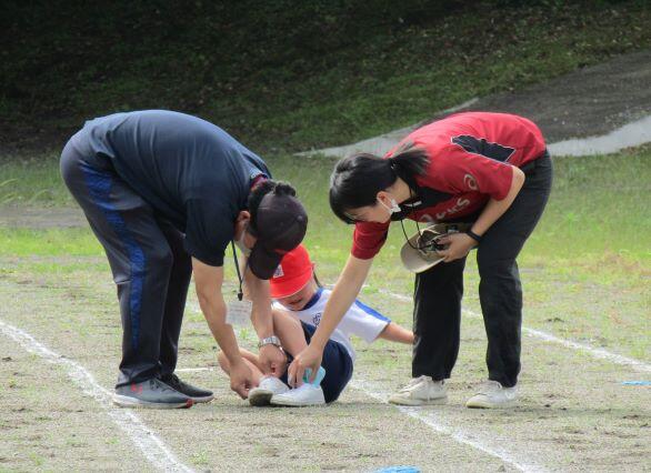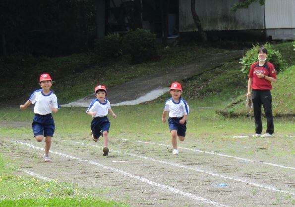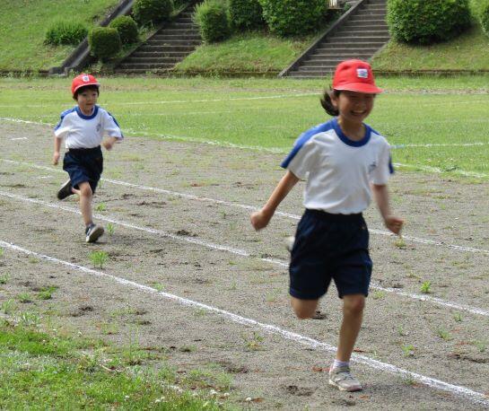 最初は50m走です。1・2年生がスタートしました!あれっ?一人いません、どうしたのでしょうか?何と、途中で