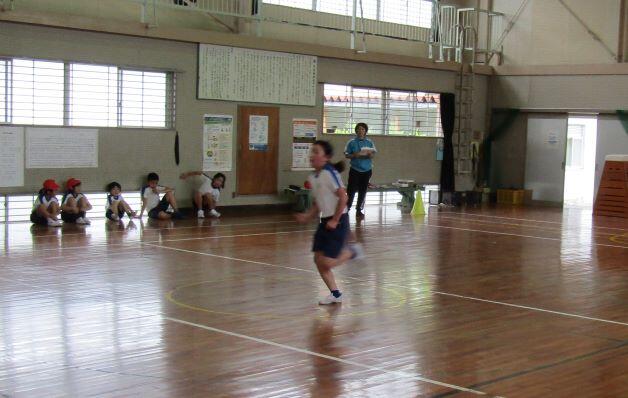 体育館に移動して、続けました。まずは、シャトルランです。2組に分かれて行いました。最後に残ったのは6年生です。