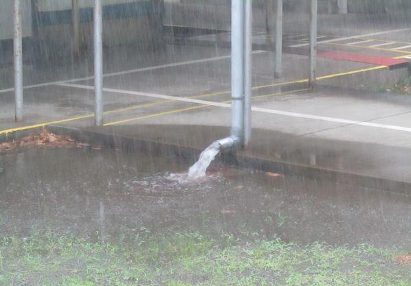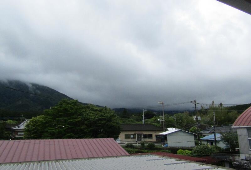 この日の幸ヶ丘三岳です。暑い雲に覆われて全くみえません。時折、激しい雨が路面を激しくたたきました。通路の屋根からの排水も激しいものでした。(>_<)