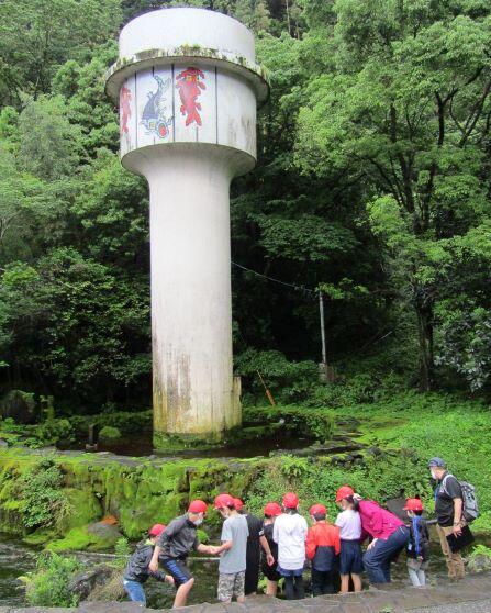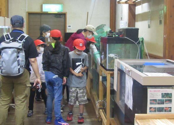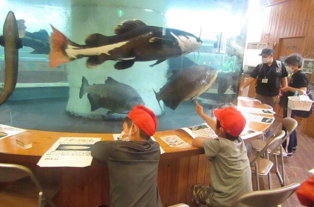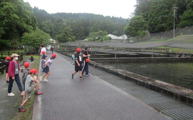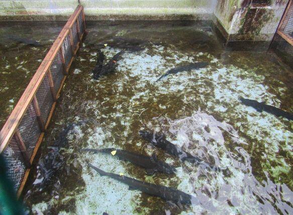 1年生は興味津々!3年生はちょっとおどおどしていました。外にはたくさんのいけすがあり、チョウザメがいっぱい、