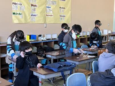 社会福祉協議会にご協力いただき、福祉体験をしました。特殊な機材を使って、高齢者の方の視界や体の動きなどを体感しました。高齢者の方のことを知って、対応の仕方を考える機会となりました。