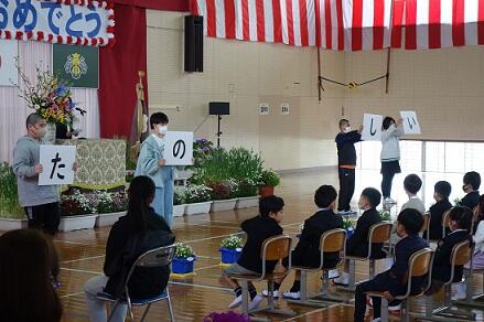 新たに新入学生を迎えて、全校児童312名となりました。歓迎とお祝いの気持ちを込めて、6年生が中心となって準備や役割を進んで行いました。1年生の返事や態度も立派でした。ご家庭の方や地域の方と一緒に祝っていただくことができ、大変うれしい式となりました。