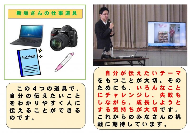 12/14(水)は、「キャリア教育」の観点から、宮崎日日新聞小林支局長の新坂英伸さんをお招きしました。取材道具や20万部の新聞が出来上がるまでの中での記者としての苦労話や、やりがいを織り交ぜながら話をしていただきました。マスコミ関係の仕事に興味がある児童もいますが、報道の華やかな部分だけでなく、多くの人々に影響を与える責任感や情報を分かりやすくまとめて伝える力の必要性を学びました。