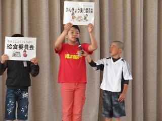 今回の児童集会は、給食委員会と保健体育委員会の発表でした。