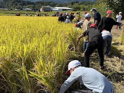 JA青年部の方々に準備とご指導をいただき、稲刈りをしました。高原町の学校給食にお米を納入してくださる有水さんの田んぼでの体験です。田植えをしてから毎日お世話していただいた稲は、たくさんの穂をつけていました。子どもたちはせっせと鎌で刈り取り、抱えてコンバインに運びました。「腕がもう動きません」「刈ったり拾ったり、大変でした」という大変さも体感しました。一方で「みんなで作業するのが楽しかった」「大きくなっていてうれしかった」という感想も聞かれました。11月に有水さんの育てたお米が給食に出されるとともに、調理実習で今回刈ったお米を提供していただくことを知った子どもたちは、大変喜んでいました。JA青年部の皆様、有水様、ありがとうございました。