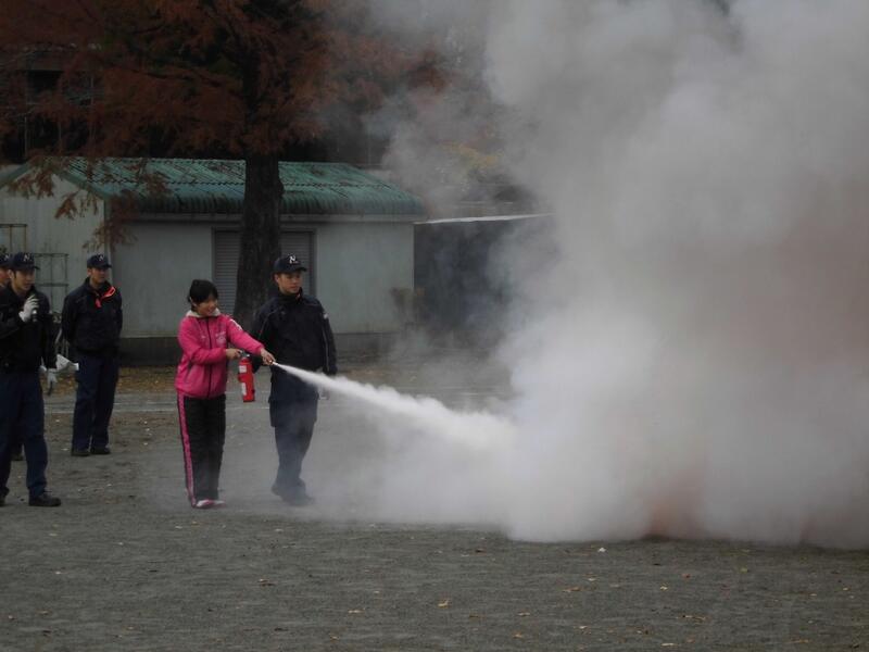 次に高原分遣所の方に消火器の使い方を教えていただきました。6年生の代表児童(前原李愛さん・原賀咲綾さん)と奥野先生が消火訓練を体験しました。消火器は3動作(ピン・ポン・パン)で使うことを教えていただきました。(上部の黄色いリングをピンと抜く・その後本体に固定されているホースをポンと外す・最後にグリップをパンと握る)