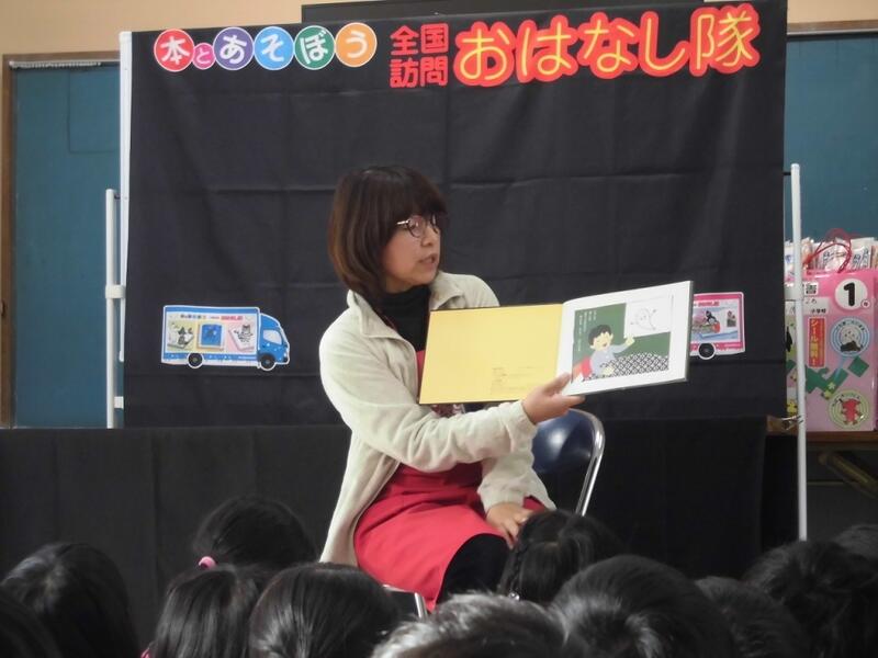 おはなし隊の方に読み聞かせいただいたり、キャラバンカーの中の絵本を自由に閲覧したりしました。本校の学校司書の前田道代先生も読み聞かせを行いました。
