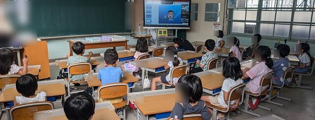 なく、「オンライン」で全校、全教室をつないで朝会を行いました。