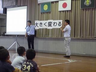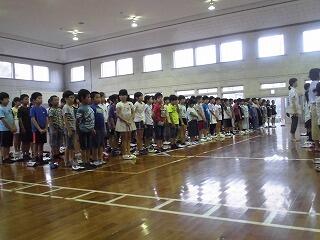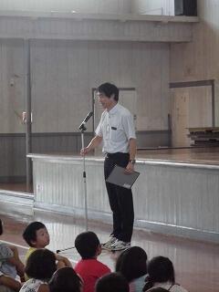 夏休み後半も安全に、また、自分のことだけでなく周りの人のことも考えて生活できるよう、全校朝会で校長先生を始め様々な先生からお話がありました。