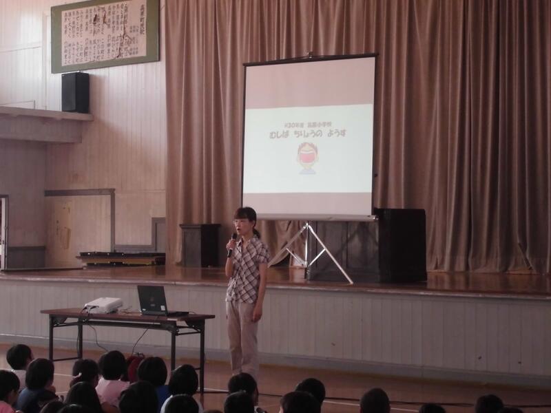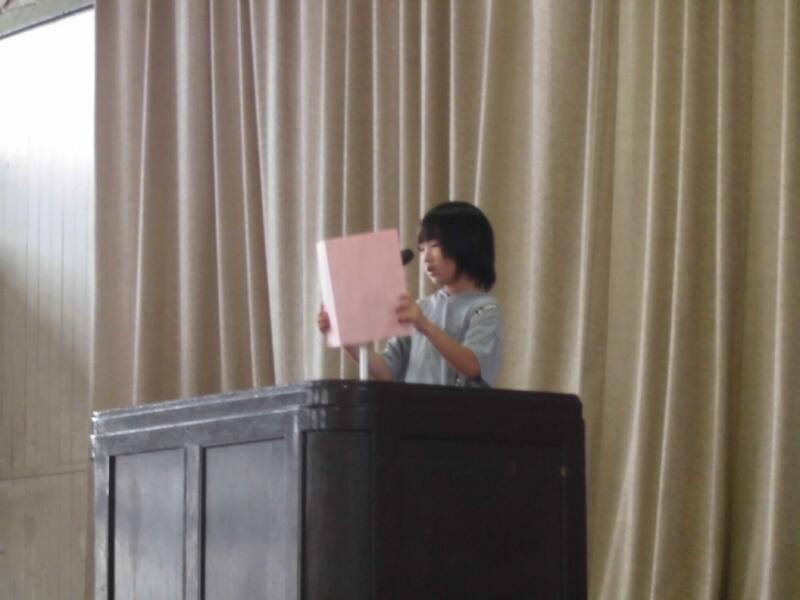 まず初めに、全校児童を代表して、2年1組の今西 美心(いまにし みこ)さんが、「1学期を振り返って」という題で、作文を発表しました。「1学期は忘れ物をしたことがあったので、2学期は忘れ物をしないようにしたい」など、前向きな言葉で発表してくれました。