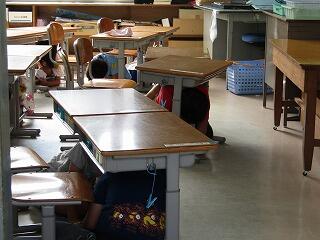 子どもたちは地震が発生したら机の下に隠れる。落ち着いたら運動場に急いで避難するなどの緊急時の行動を真剣に行うことができていました。