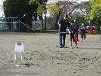 次に高原分遣所の方に消火器の使い方を教えていただきました。6年生の代表児童(前原李愛さん・原賀咲綾さん)と奥野先生が消火訓練を体験しました。消火器は3動作(ピン・ポン・パン)で使うことを教えていただきました。(上部の黄色いリングをピンと抜く・その後本体に固定されているホースをポンと外す・最後にグリップをパンと握る)