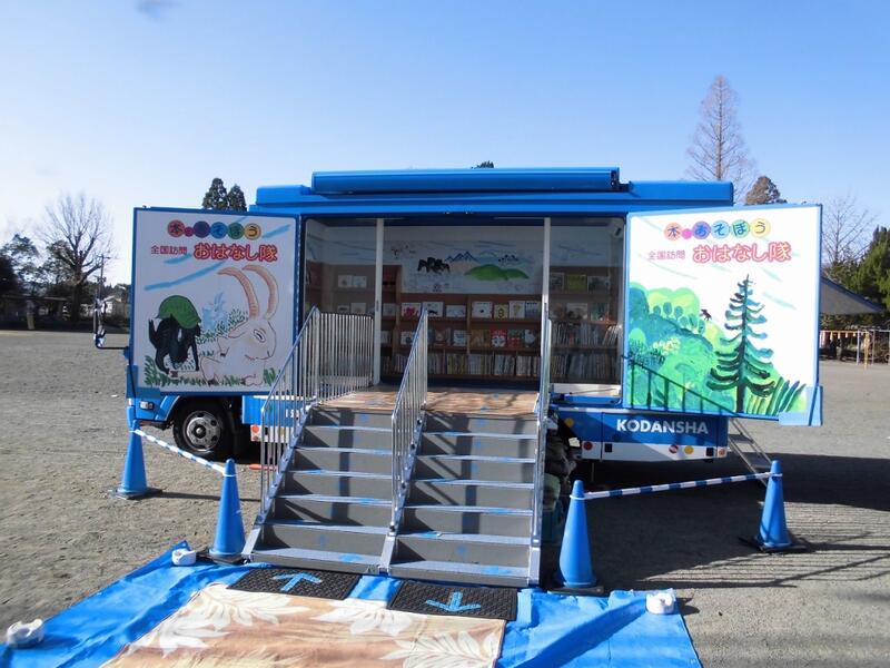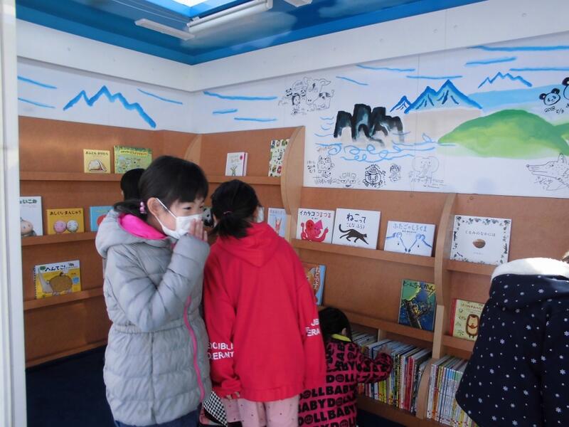 おはなし隊の方に読み聞かせいただいたり、キャラバンカーの中の絵本を自由に閲覧したりしました。本校の学校司書の前田道代先生も読み聞かせを行いました。