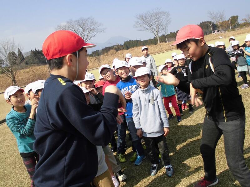 お別れ遠足では、全校児童でクイズやじゃんけん列車をして楽しみました。