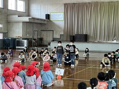 保育所・幼稚園の年長児さんと1年生の交流活動がありました。1年生が生活科で作った「秋のおもちゃ」で、年長児さんが楽しめるように計画しました。まず、はじめの会で、一緒に歌を歌ったり、けん玉で遊んだりしました。続いて、年長児さんが、1年生のおもちゃのお店を回って楽しみました。1年生は、年長児さんが楽しめるように見守ったり、アドバイスをしたり、成功したら一緒に喜んだりしており、成長を感じました。また、年長児さんもお話をよく聞いて1年生とのかかわりや遊びを楽しんでいました。とても充実した時間になりました。