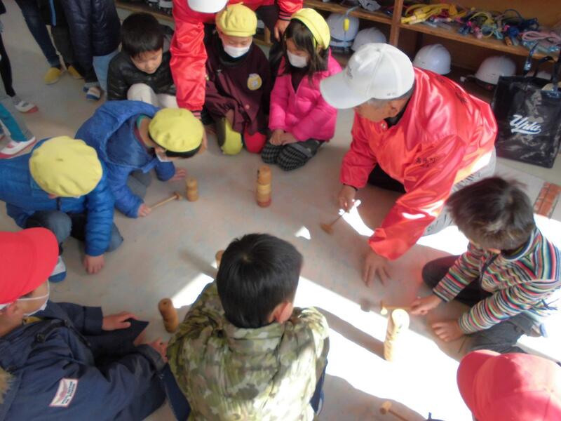 2月10日に地域の大人の方や次年度入学予定の子ども達を招いたオープン参観で、1年生と一緒に「昔の遊び」活動を行いました。