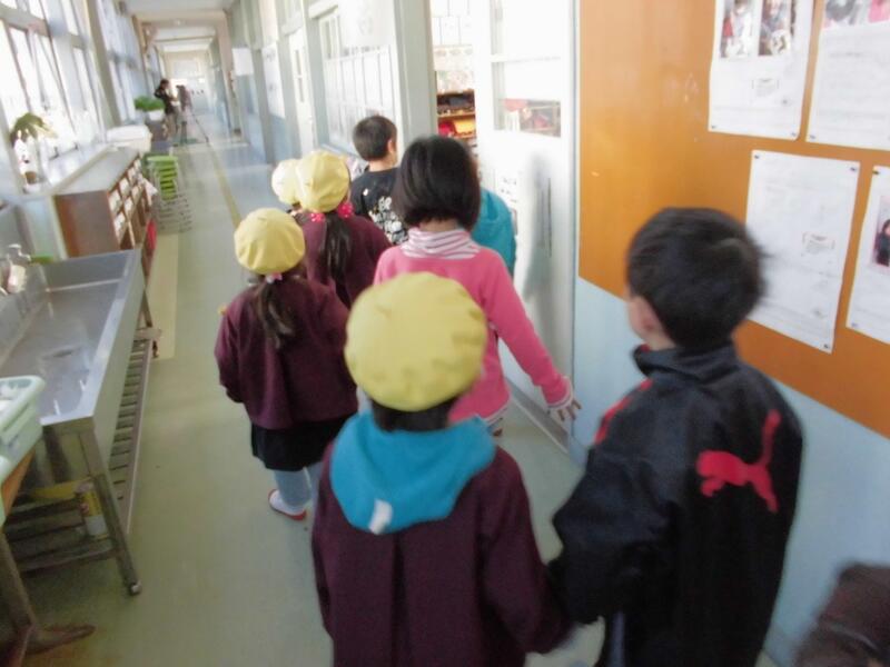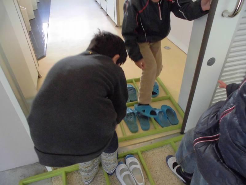 休み時間のことです。1年生がトイレのスリッパを並べています。自分が使ったスリッパだけではなく、他のスリッパも並べています。他の人のことも考えている、優しい行動ですね。