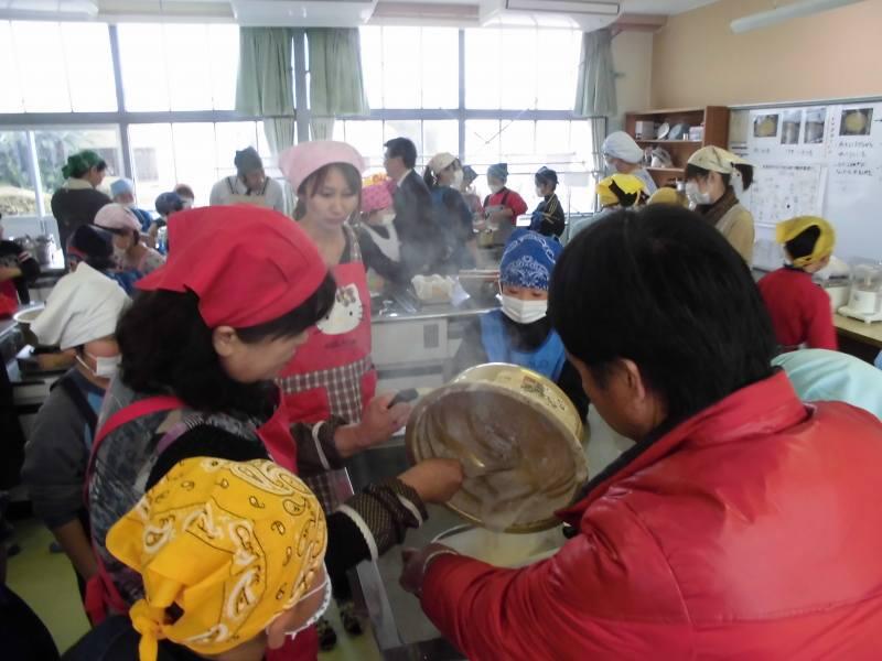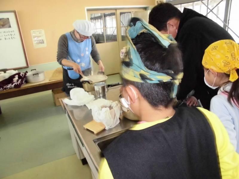 3月19日に3年2組が豆腐作りをしました。地域の方や保護者の方にも協力して頂いて、おいしい豆腐ができました。きめの細やかなおからもできました。来週は3年1組が挑戦します。