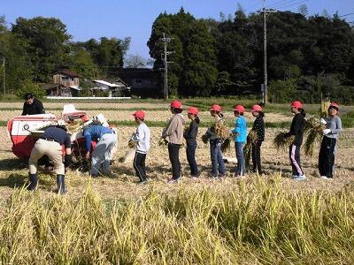 秋空のもと、5年生が鎌を使って稲刈りをしてきました。