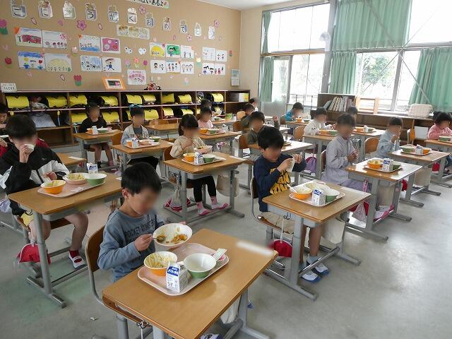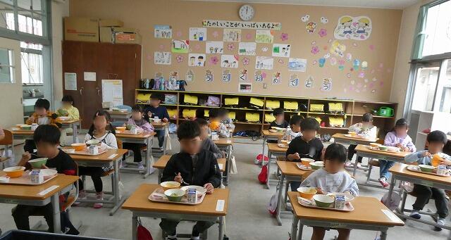 ュー。小学校はじめての給食に子どもたちは、舌鼓を打っていました