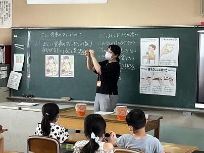 栄養教諭による食育の授業が行われています。今回は3年生を対象に、「正しい食事のマナーについて知り、自分が気をつけることを決めよう」という目標で授業が進められました。正しい茶碗やはしの持ち方、食べるときの姿勢を確認した後、これから気をつけることを決めました。