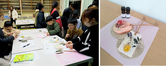 本校保護者が講師となった本講座のテーマは「アロマワックスサシェづくり」、香りの理論についての説明を受けた後、実際に製作する活動を行いました。
