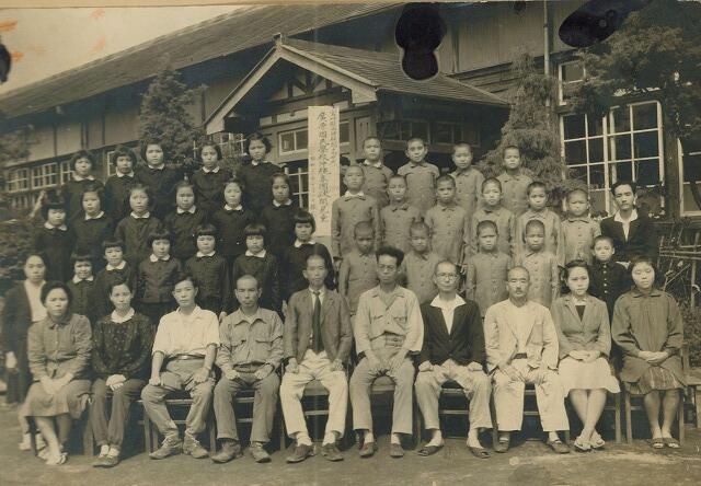 100周年記念誌(昭和49年発行)によりますと、昭和19年に、沖縄からの疎開児童を受け入れたという記録が残っています。宿泊する場所がなかったため、学校の裁縫室を整理し、冬寒い時期に、布団がなくて困っているということから、各家庭から布団を調達したりと、地域の方の手厚い支援が感じられます。疎開に来た児童は、昭和21年には全員帰還できたとのことですが、下の写真はその時のものだそうです。本地区から帰還した子供たちは、沖縄で全員お迎えがあったとのことです。その翌年には、沖縄より、感謝のためにとのことで数名招待されております。